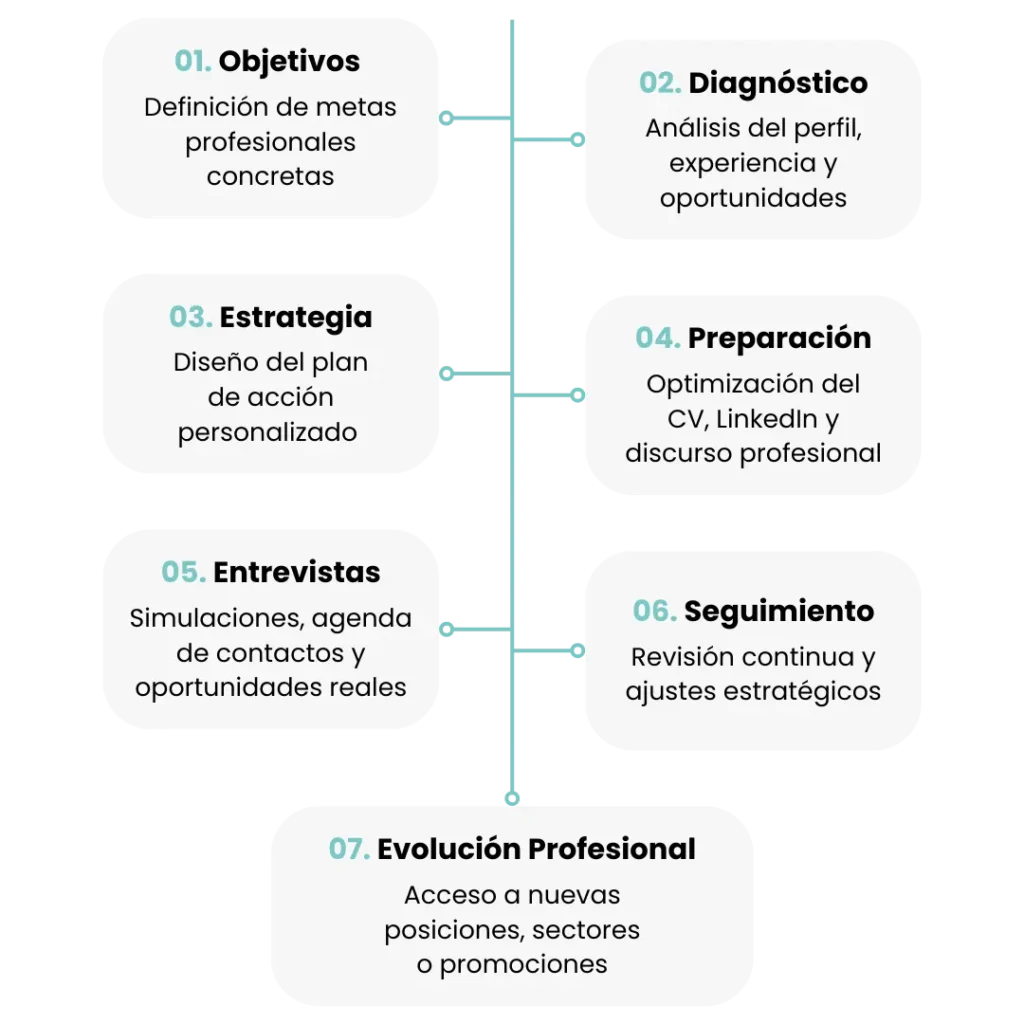 El Departamento de Carreras diseña planes individuales orientados a objetivos concretos: encontrar empleo, cambiar de sector o acceder a posiciones de mayor responsabilidad dentro del entorno empresarial actual.
