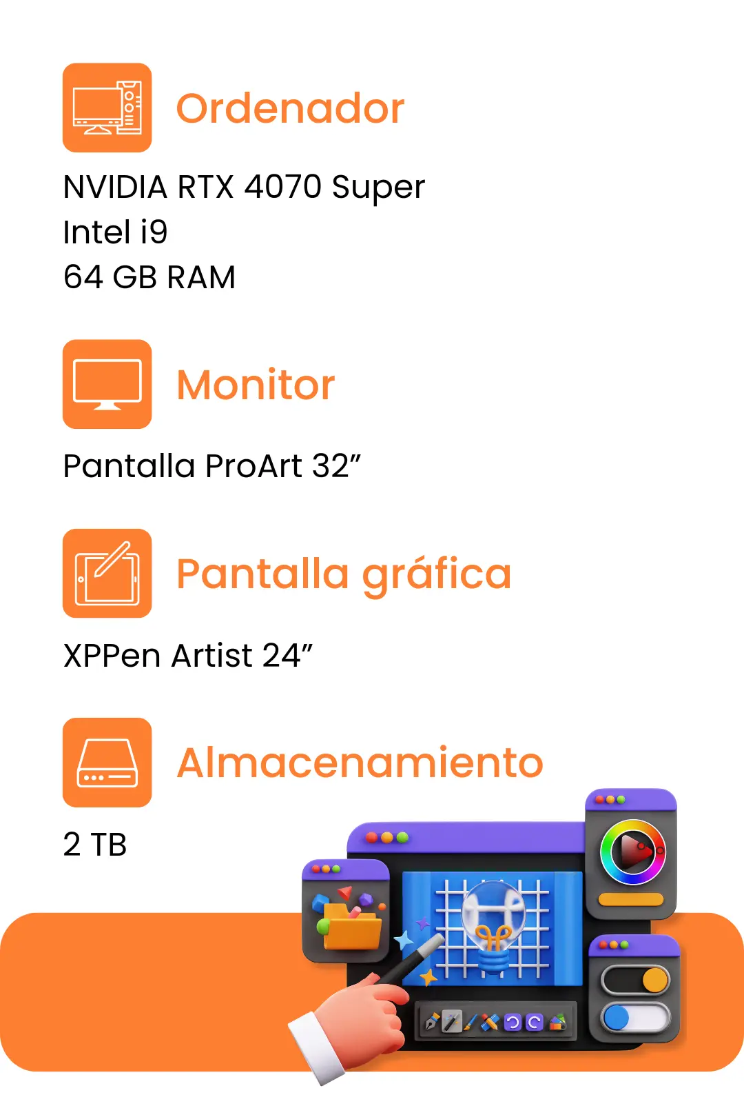 El campus Cesuga, en A Coruña, cuenta con el mejor equipamiento educativo de Galicia para animación 3D, diseño digital y videojuegos, comparable al de muchos estudios profesionales. Cada alumno trabaja con estaciones de alto rendimiento: tarjetas gráficas NVIDIA RTX 4070 Super, 64 GB de RAM, procesadores Intel i9 de última generación, monitores ProArt de 32” y pantallas gráficas XPPen Artist de 24”. Además, cada aula dispone de 2 TB de almacenamiento compartido, ideales para proyectos de animación y renderizado de alto nivel. Estudiar aquí es trabajar desde el primer día con tecnología de estándar profesional.